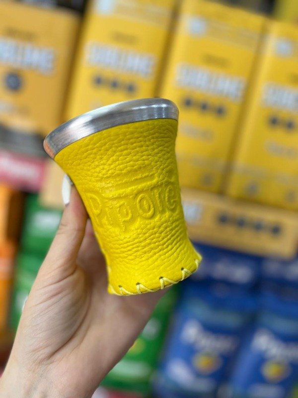 Mate Pipore Vidrio Forrado en Cuero Amarillo